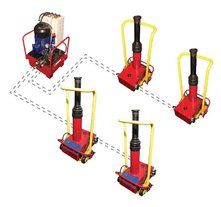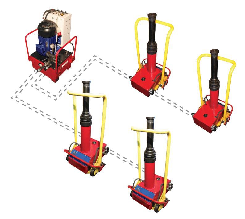 Гидростанции для гидравлических домкратов используются для привода устройств подъема и перемещения грузов. Станции обеспечивают подачу жидкости от 1,6 до 25 л/мин, с высоким давлением – до 700 бар. При работе подъемных механизмов определяющим является усилие на штоке, которое прямопропорционально максимальному давлению и площади поршня. Высокое давление позволяет снизить металлоемкость и массу домкрата. Объем бака определяется количеством масла, необходимого для заполнения всех домкратов в гидросистеме при выдвижении штока на полный ход, и обычно не превышает 250 литров.