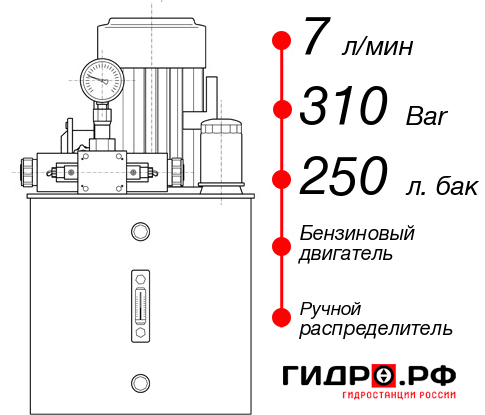 Маслостанция НБР-7И3125Т с гидравлическим контуром 7 л/мин и давлением 310 bar. В конструкции используется бак на 250 л и бензиновый мотор. Распределитель ручной. Цена с доставкой до Вашего цеха в Воскресенске 238414 руб. Рекомендуем дооснастить: теплообменный охладитель.