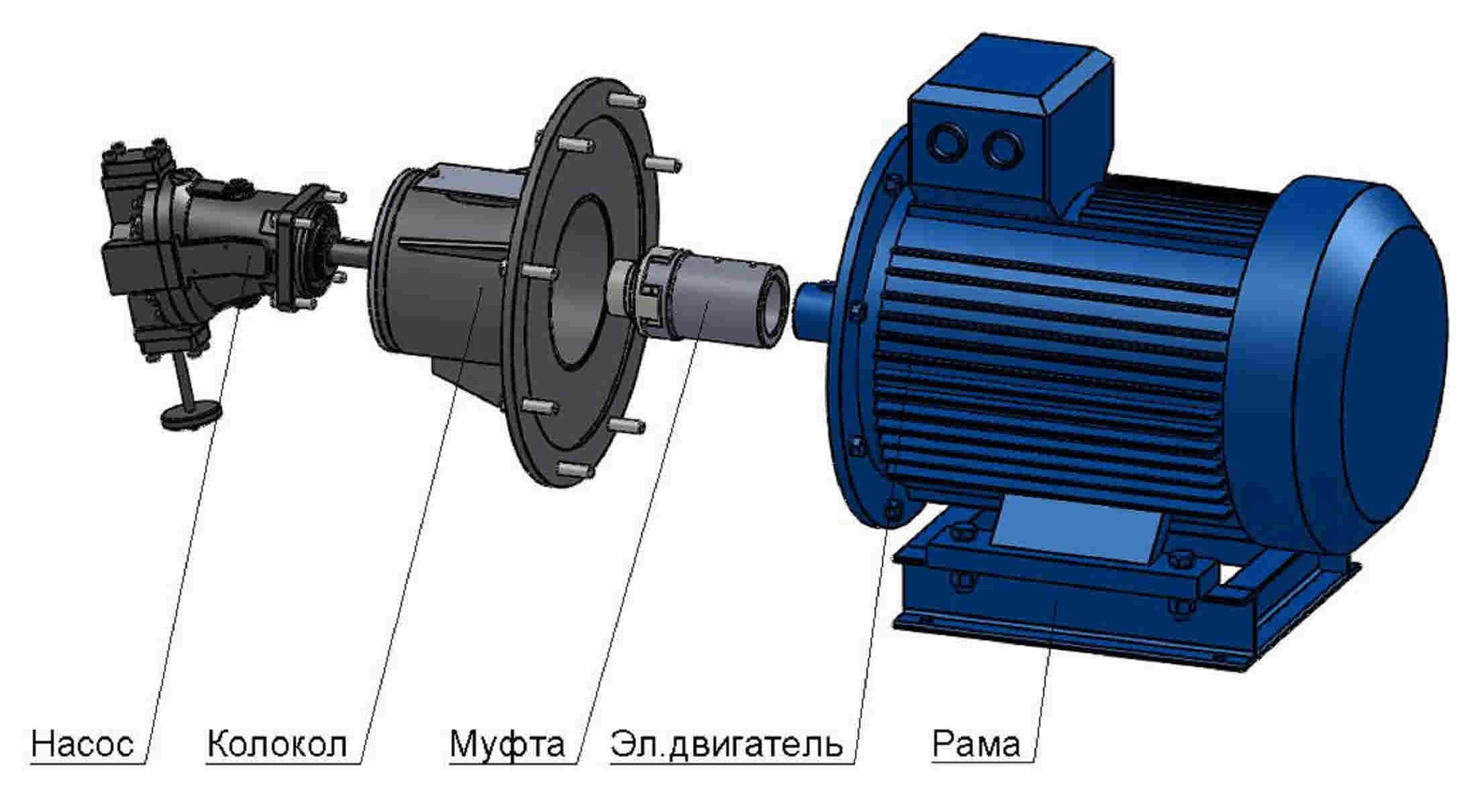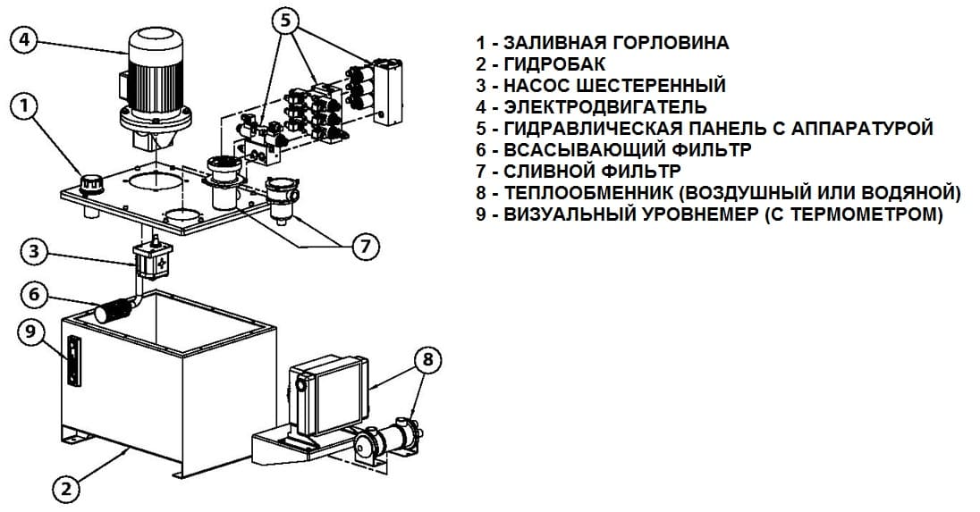Проектом предусматривается сборка станции из отдельных узлов. Основными из них являются насос и силовой агрегат. Кроме того, в зависимости от комплектации возможна установка контрольных и предохранительных устройств – датчиков давления, температуры, расхода и т.п. Для поддержания чистоты рабочей жидкости используются фильтры тонкой очистки.